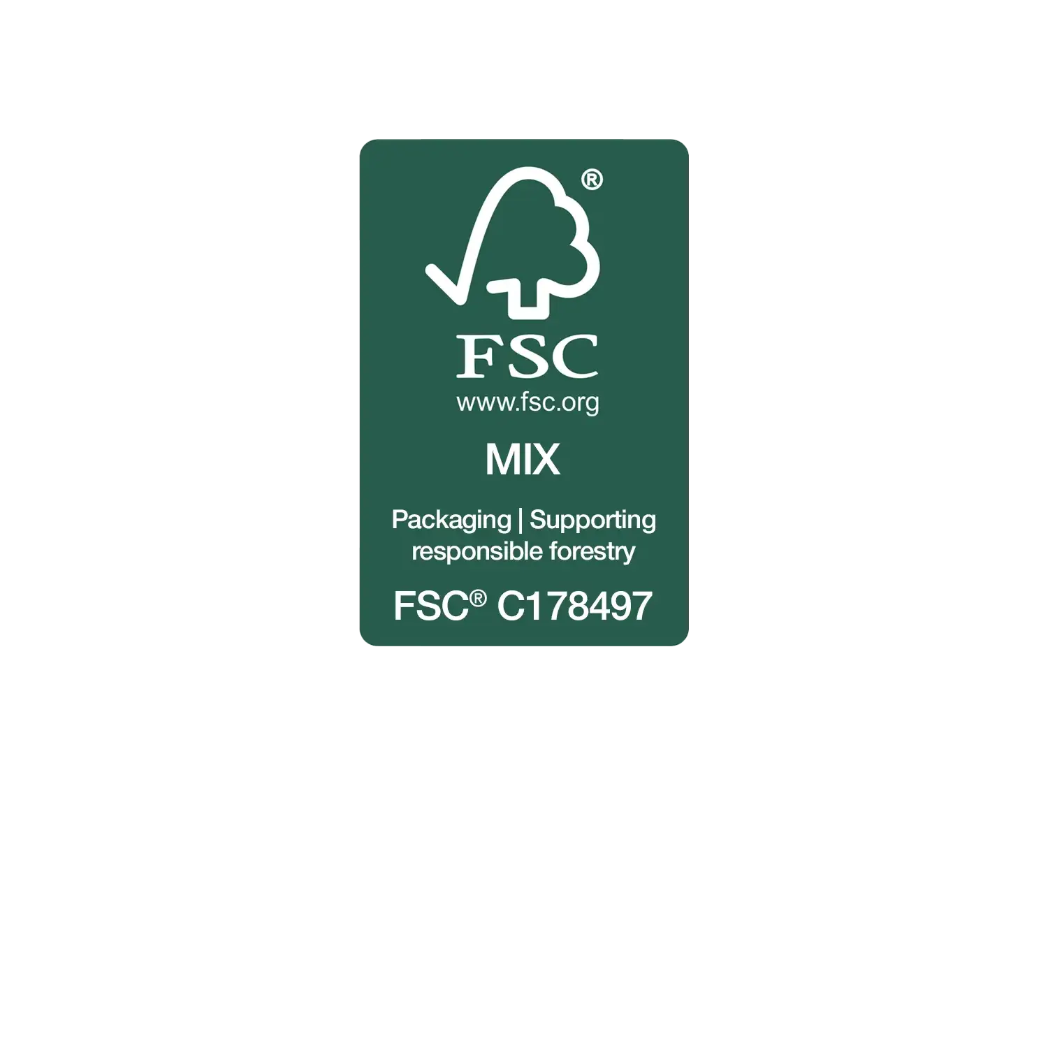 Our packaging materials are FSC certified, ensuring they come from responsibly managed forests that provide environmental, social, and economic benefits.